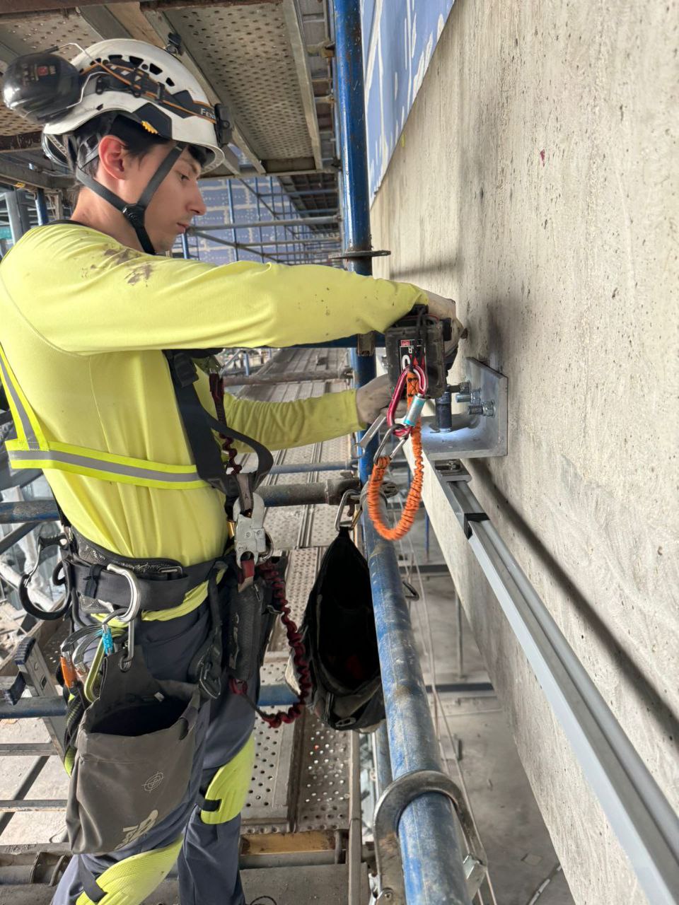 Для гарантии безупречного соответствия проектной документации разметка под анкерные крепления на объекте выполнялась с применением геодезического оборудования. Это позволило обеспечить максимальную точность и надежность будущей системы, что критически важно для безопасности высотных работ.